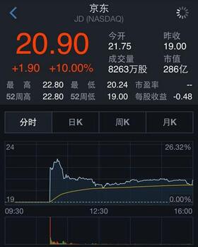 京东股票于北京时间5月22日23点开始交易,开盘价21.75美元,当日最高涨至22.50美元,最低至20.24美元,报收于20.90美元,较19美元的发行价上涨10%。
