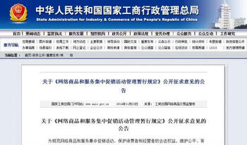 1月6日消息,国家工商行政管理总局今日在其官方网站公布《网络商品和服务集中促销活动管理暂行规定(征求意见稿)》向社会公开征求意见。