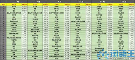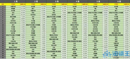2017年,这个表格可以做为品类总参考指南,很容易就能成看出来每一个月的品类交易支付金额占比。哪一个月的品类卖得最好,什么时候升?什么时候降?涨幅是多少?降幅是多少?一目了然!