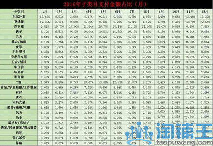 以下是2016淘宝女装全年的子类目支付金额占比表: