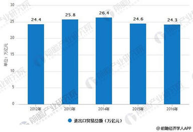 受全球经济不振、国内制造业转型等因素的影响,近两年我国外贸交易总额持续下滑,2015、2016 年进出口贸易总额分别为 24.6 万亿和 24.3 万亿元,同比下降 7.0%和 1.0%。