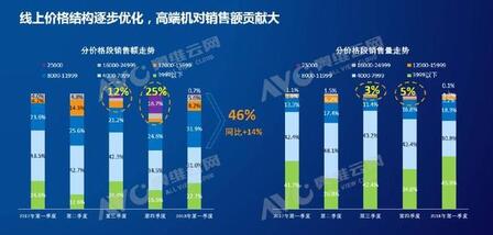 线上市场新风产品价格变化较大,整体仍然以8000元以下的低端机销售为主,整个2017年低端机销售量占比80%,销售额占比60%。低端机的销售额转换率并不高,相反高端机对销售额的贡献度是比较大的。2017年三季度3%的高端机销售贡献了12%的销售额,第四季度5%的销量贡献了25%的销售额。再看刚刚过去的2018年第一季度高端机销售额占比14%,同比增长5.8%。同时8000以上的产品整体占比已经达到46%,同比增长14%,接近一半的水平。这一趋势说明线上消费者不在一味的追求低价和实惠,随着消费购买心理的理性化以及对环境健康的重视,加上线上消费环境变的更加安全放心,线上的消费者也正在逐步接受高品质高价格的新风机。