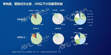 从产品结构来看,由于考虑到安装与价格的问题,单向流和壁挂式仍然是线上的主流产品。从风量来看,200以下小风量销售量占比为66%。200-300风量与300-400风量的新风系统占比也在逐步增加。