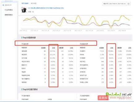 在这里我们还能看到流量比例,我们看下图,他现在手淘这个占比是他整个店铺流量结构的百分之60%。这种情况也不用担心,只要我们把他的交易词和流量词盯紧,我们就能将对方轻易干掉。