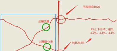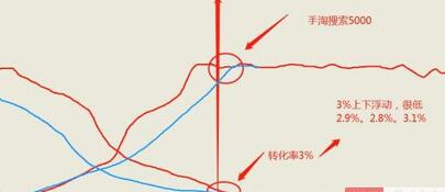 蓝框右边是其稳定后的数据,搜索流量是5000,转化率在3%上下波动,客单价是恒定的,那么UV价值也就是一上下浮动的恒定值。