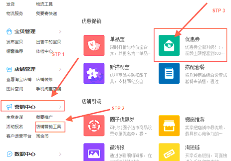 首先进入到优惠券工具页面,进入方法【卖家中心】-【营销中心模块下】找到【店铺营销工具】-【优惠券】如果没有购买该工具的,页面会提示订购