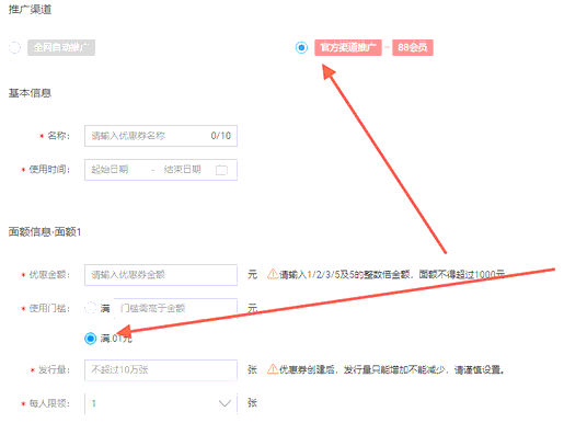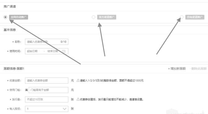在进入到店铺优惠券设置页面后,有三个按钮,分别是【全网推广】【官方渠道】【自有渠道】