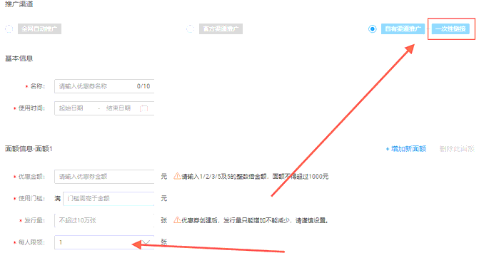 【自有渠道】重点来了这个页面下设置的优惠券就拥有隐藏效果了。也拥有两种,分别是:通用领取链接和一次性领取链接。
