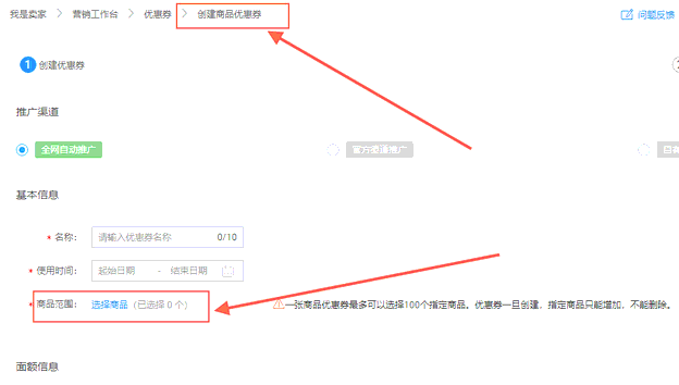 【全网推广】这个按钮下创建的优惠券,会自动展示到详情页的价格下面,电脑端只能展示两个,再多的就展示不出来了,你想让买家看到,就需要在别处装修之后才行。也只有这种优惠券能在商品价格下面展示。