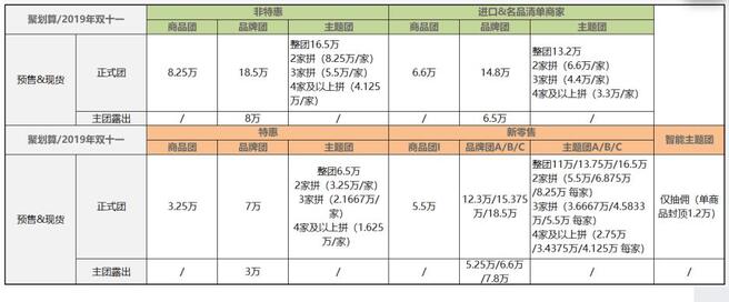 11、本次聚划算2019年双十一大促的品牌/主题团商家可报名商品数量如下表: