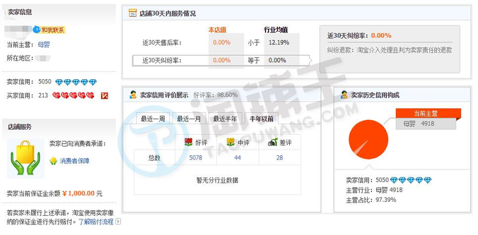 卖家描述: 5钻母婴,个人店铺,动态清零,协议变更,淘信用600,体检中心干净,无违规扣分,无虚假售假,好评98,主营占比97,看上联系业务员