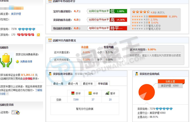 卖家描述: 五钻美容护理个体店,协议变更出售,动态偏红,12年注册店铺,去年有售假扣了2分,好评99%+,无贷款,卖家诚心出售,欢迎咨询