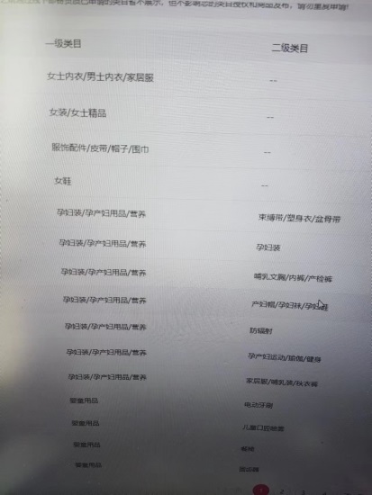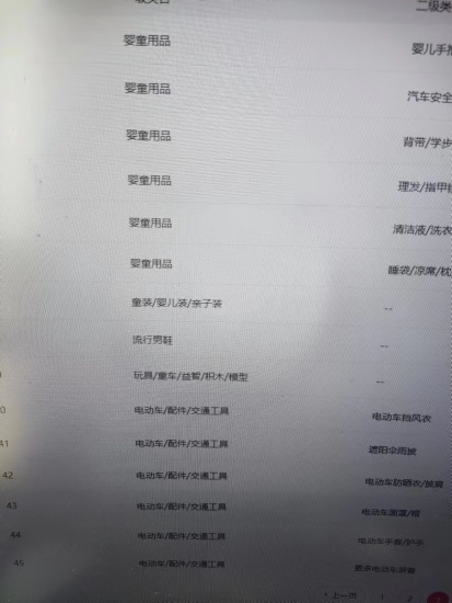 一级类目:服饰配件/皮带/帽子/围巾,女装/女士精品,男装,女士内衣/男士内衣/家居服,童装/婴儿装/亲子装,孕妇装/孕产妇用品/营养,玩具/童车/益智/积木/模型