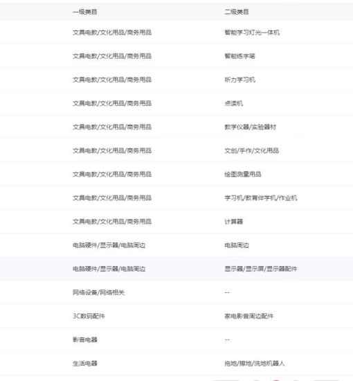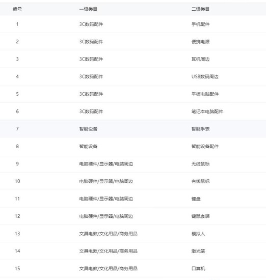 一级类目:3C数码配件,办公设备/耗材/相关服务,文具电教/文化用品/商务用品,智能设备,电脑硬件/显示器/电脑周边,生活电器,影音电器