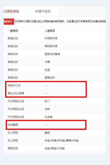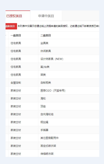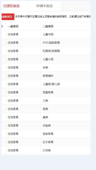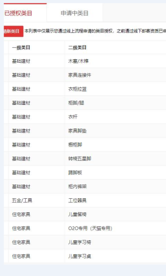 一级类目:基础建材,居家布艺,家居饰品,五金/工具,电子/电工,住宅家具,全屋定制,商业/办公家具,特色手工艺,家装主材,文具电教/文化用品/商务用品,包装,3C数码配件,汽车用品/电子/清洗/改装