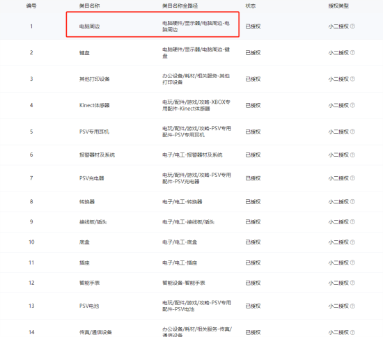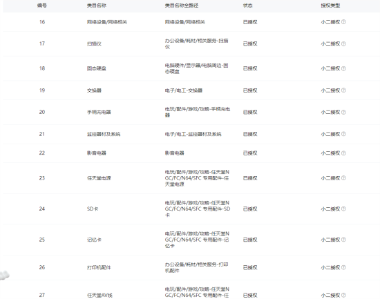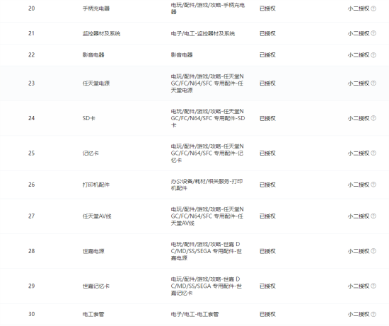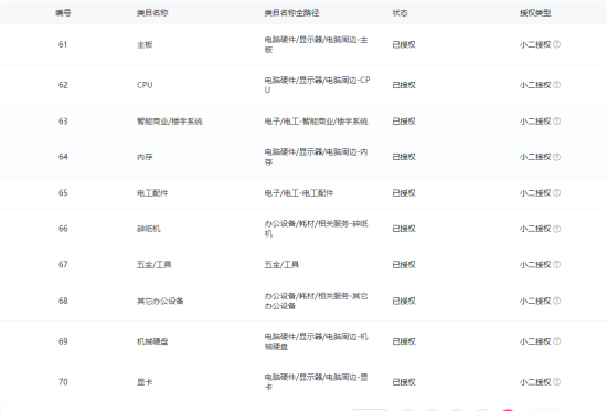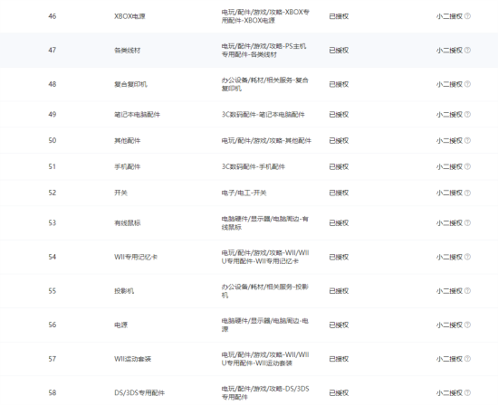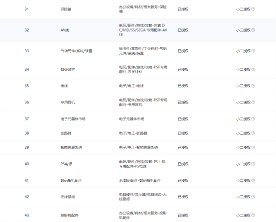 一级类目:办公设备/耗材/相关服务,智能设备,电子元器件市场,五金/工具,电子/电工,网络设备/网络相关,电脑硬件/显示器/电脑周边,3C数码配件,电玩/配件/游戏/攻略,影音电器